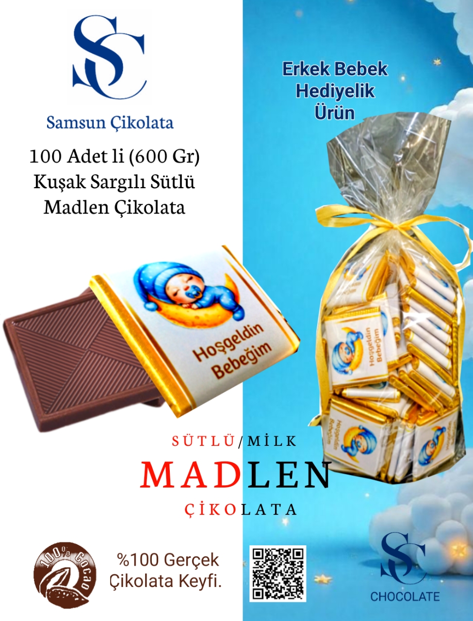 100 Adetli 600 Gr Erkek Bebek Kuşak Sargılı Sütlü Madlen Çikolata